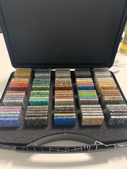 Kaufen Sie sich einen Steinteppich Musterkoffer mit einer Auswahl von über 200 verschiedenen Materialfarben, zur Präsentation der Quarz- und Marmorkiesel beim Kunden.